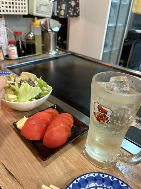 トマトや牡蠣などサイドメニューをいくつかと、メインでもんじゃとお好み焼きを注文。